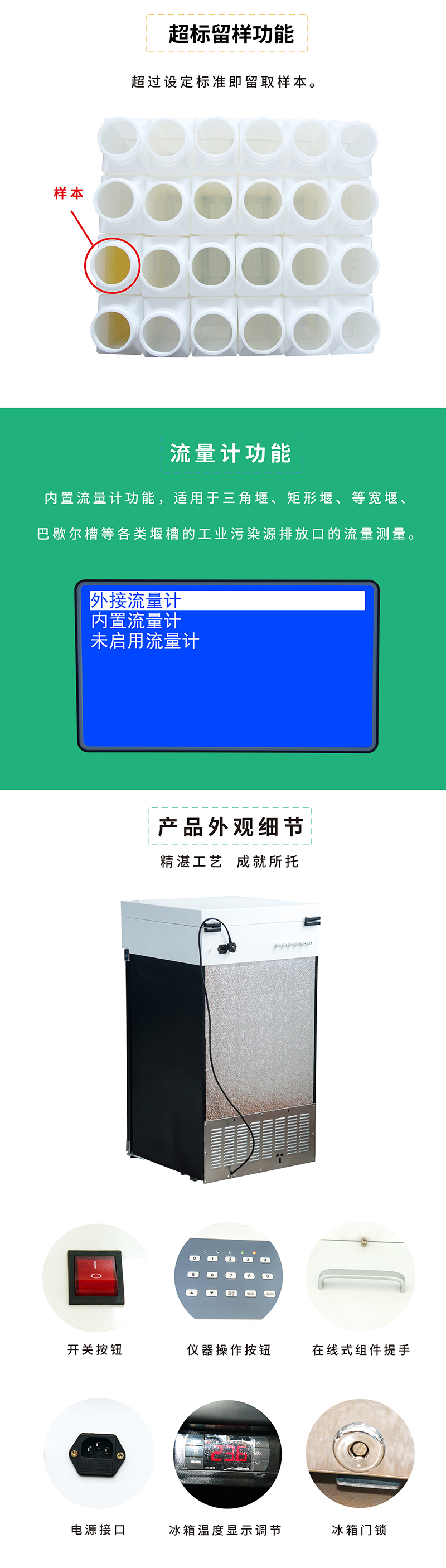 6、多種采樣功能:定時(shí)定量采樣、定流定量采樣、流量比例采樣、液位比例采樣、即時(shí)定量采樣等;