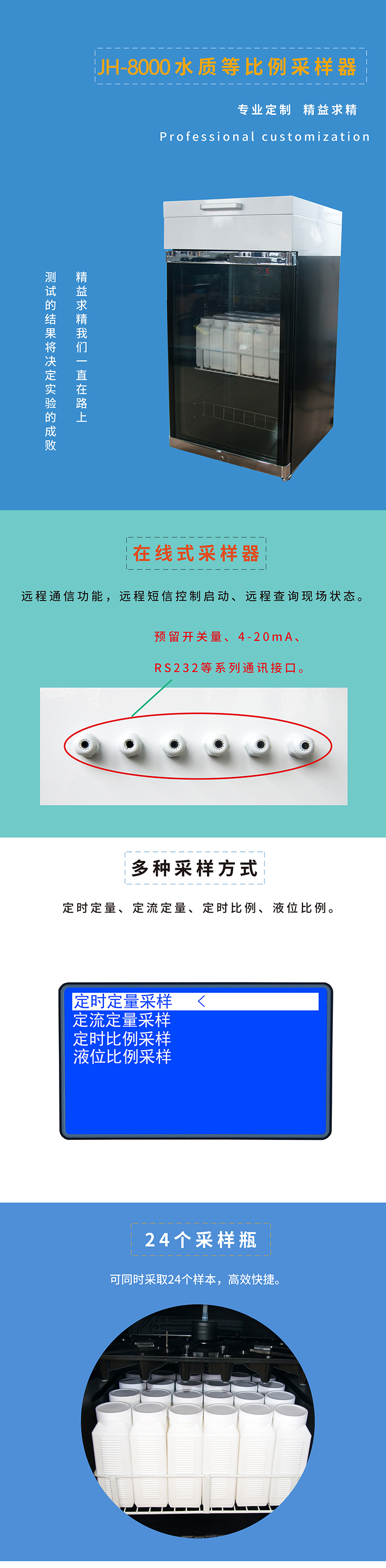 JH-8000K型在線式水質(zhì)等比例采樣器是依據(jù)國(guó)家環(huán)境監(jiān)測(cè)技術(shù)規(guī)范要求,結(jié)合我國(guó)環(huán)境污染狀況及各*環(huán)境監(jiān)測(cè)部門的需要而研制開發(fā)的,是一種可實(shí)現(xiàn)按時(shí)間、體積比例、定流比例等方式完成采集污水樣品的智能采樣器,符合國(guó)家環(huán)保部HJ/T 372-2007《水質(zhì)自動(dòng)采樣器技術(shù)要求及檢測(cè)方法》行業(yè)標(biāo)準(zhǔn)的要求,性能穩(wěn)定、功能強(qiáng)大,能滿足用戶的各種采樣應(yīng)用需求。