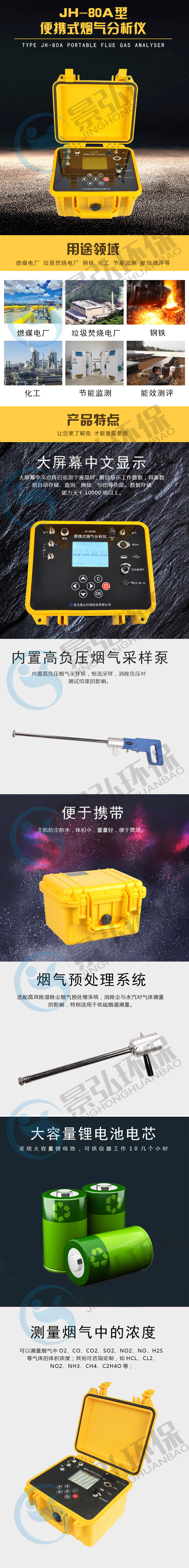 JH-80A型便攜式煙氣分析儀主要采用NDIR非分光紅外和電化學(xué)技術(shù),用于直接測量煙氣中的O2、CO、CO2、SO2、NO2、NO、H2S等氣體的濃度(其他可咨詢定制,如HCL、CL2、NO2、NH3、CH4、C2H4O等)。配套測溫一體化采樣槍,同時測量煙氣溫度、煙氣壓力及流速等參數(shù)。該產(chǎn)品的主要特點是精度高、體積小、攜帶方便、操作簡單,主要應(yīng)用于燃煤電廠、垃圾焚燒電廠、鋼鐵、化工、節(jié)能監(jiān)測、能效測評、燃燒研究等領(lǐng)域。