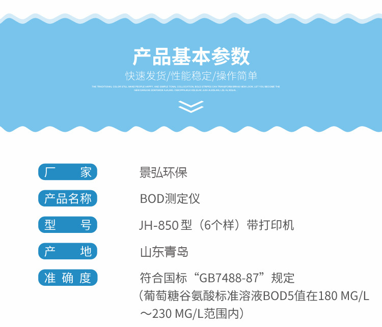 JH-850微電腦數(shù)顯式BOD測定儀是利用空氣壓差法進行生化需氧量測定的一種儀器,能提供與化學(xué)稀釋法可比的測定結(jié)果,具有讀數(shù)直觀,生化反應(yīng)曲線一目了然和使用維護方便等特點,可應(yīng)用于環(huán)保監(jiān)測、石油化工、醫(yī)療衛(wèi)生、教學(xué)科研等部門對水質(zhì)的監(jiān)測。