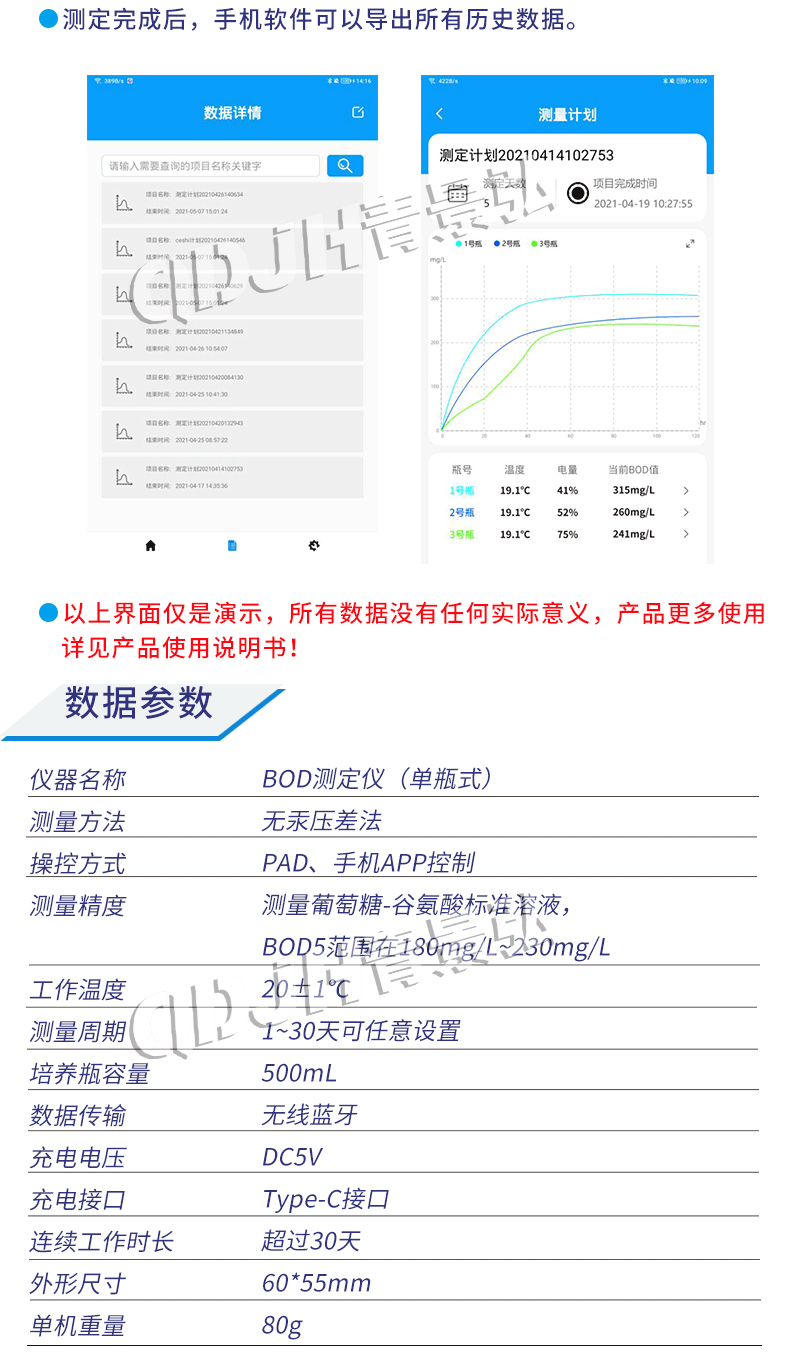 JH-801型BOD測(cè)定儀是根據(jù)國(guó)標(biāo)《HJ505-2009 水質(zhì) 五日生化需氧量(BOD5)的測(cè)定 稀釋與接種法》規(guī)定,模擬自然界中有機(jī)物的生物降解過(guò)程,采用簡(jiǎn)單、安全、可靠的無(wú)汞壓差感測(cè)法測(cè)量水質(zhì)BOD值。儀器采用智能測(cè)控技術(shù),測(cè)量全過(guò)程通過(guò)手機(jī)APP進(jìn)行控制、查看,無(wú)線數(shù)據(jù)傳輸,可實(shí)現(xiàn)多組設(shè)備的自動(dòng)重連匹配,方便實(shí)時(shí)查看測(cè)定數(shù)據(jù)結(jié)果??蓮V泛適用于環(huán)境監(jiān)測(cè)站、第三方檢測(cè)機(jī)構(gòu)、科研、高校以及污水排放企業(yè)等。