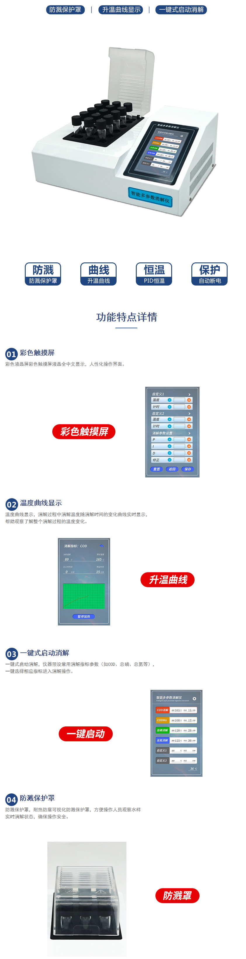 3.防濺保護罩,耐熱防腐可視化防濺保護罩,方便操作人員觀察水樣實時消解狀態(tài),確保操作安全。