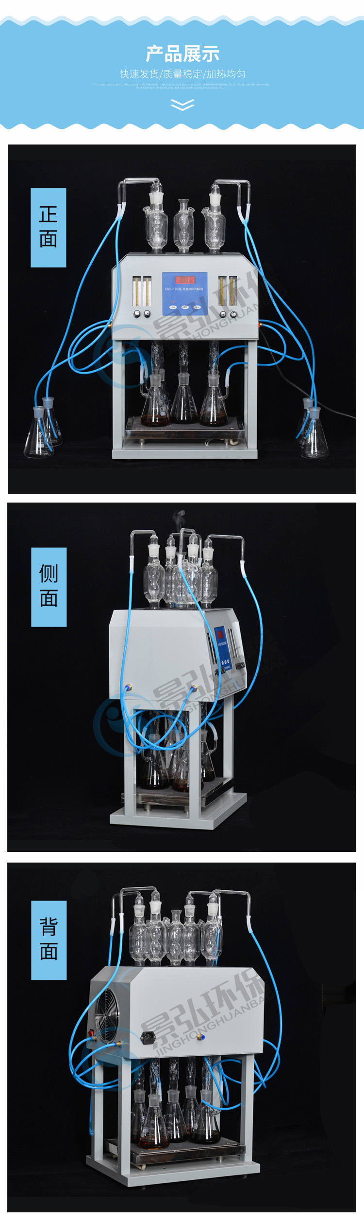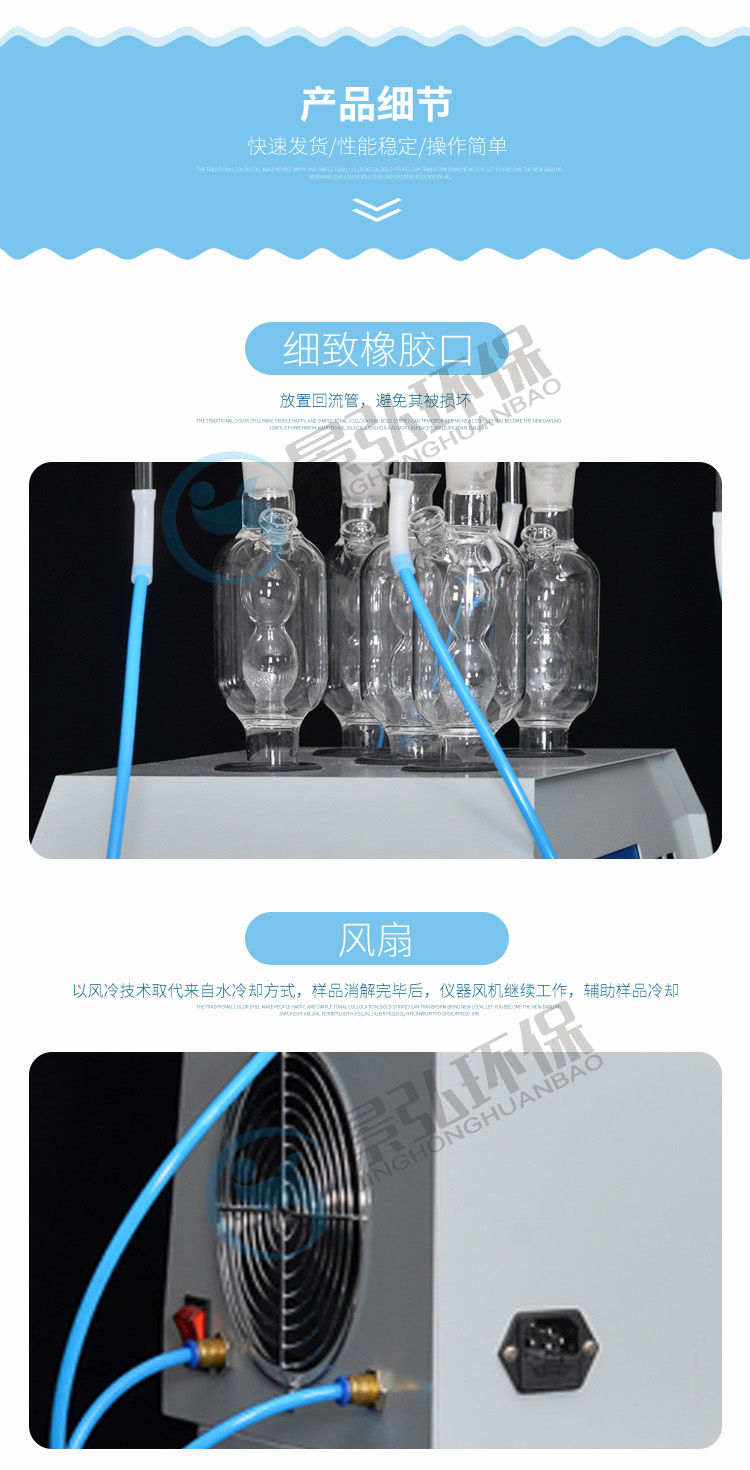 2、采用玻璃毛刺回流管代替球形回流管,并以風冷技術取代自來水冷卻方式,既可以節(jié)水又能使儀器規(guī)范化,同時還提高了儀器使用的安全性。