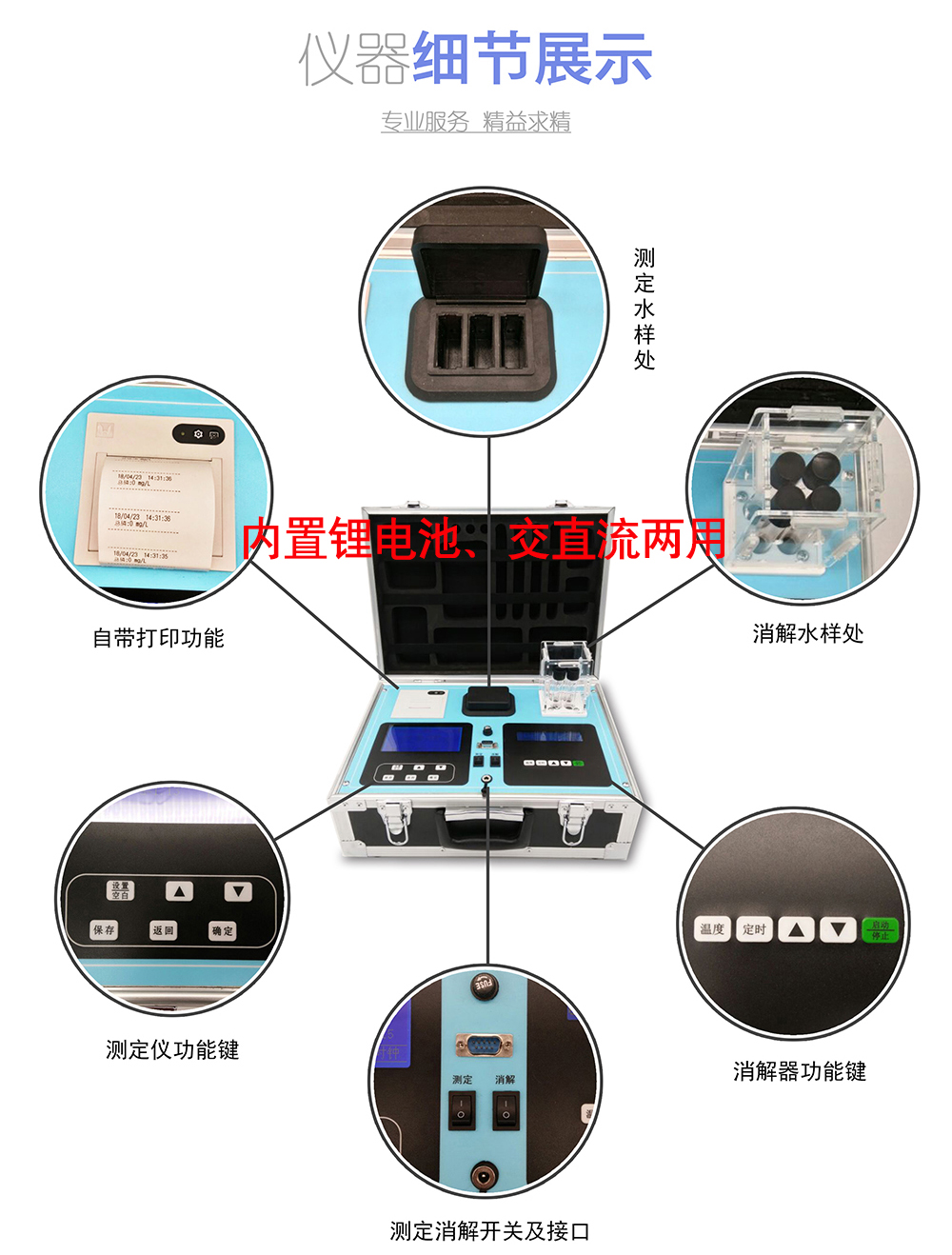 14.儀器內(nèi)置直流電源,鋰電池供電,可實現(xiàn)多批水樣加熱消解及比色測定。