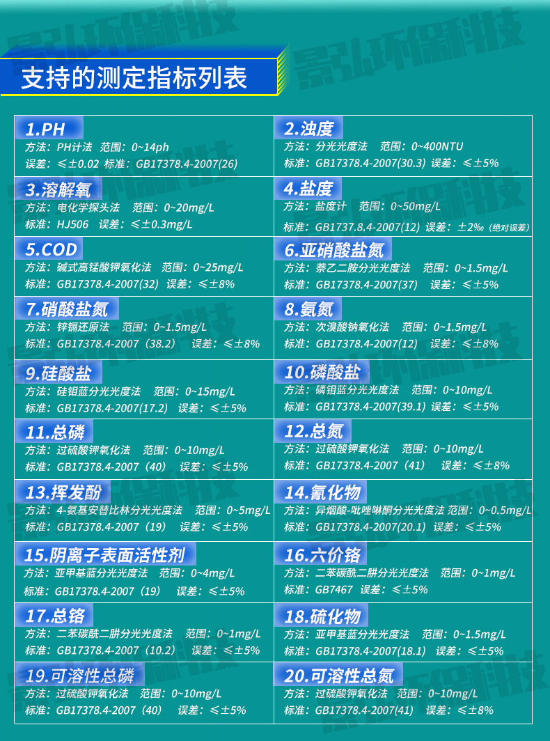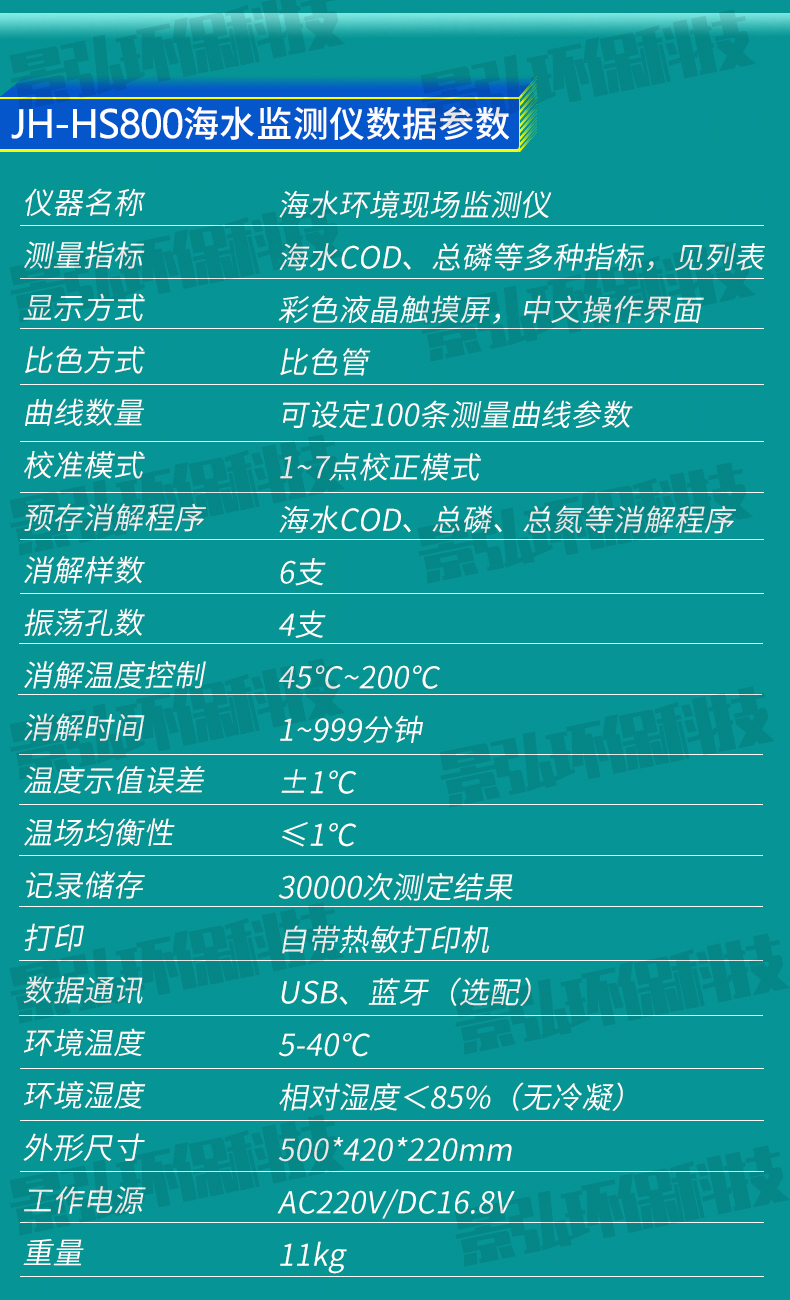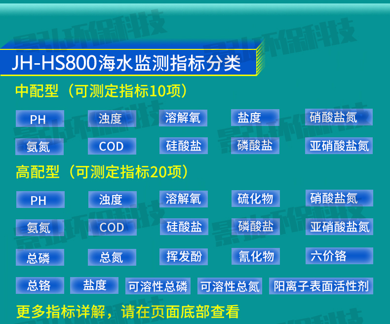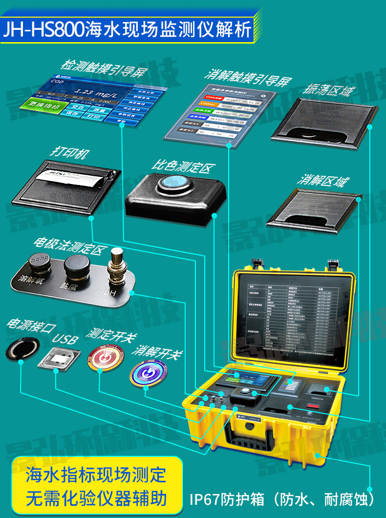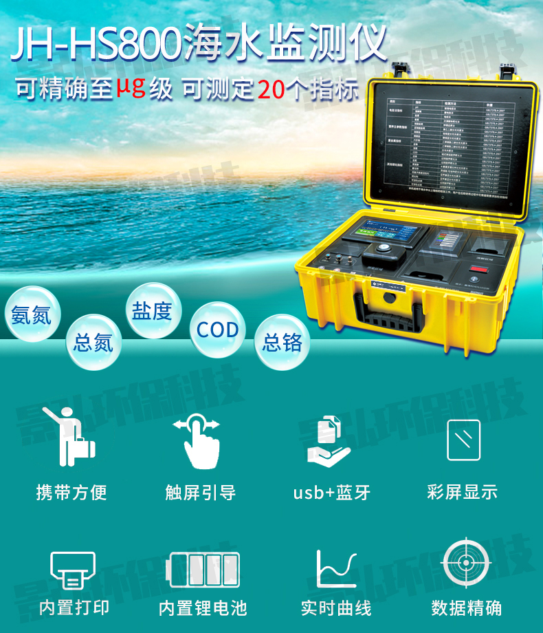 JH-HS800 型海水環(huán)境現(xiàn)場監(jiān)測儀(旗艦版):【PH、濁度、溶解氧、鹽度、COD、氨氮、硝酸鹽氮、亞硝酸鹽氮、硅酸鹽、磷酸鹽、總磷、總氮、揮發(fā)酚、氰化物、陰離子表面活性劑、六價鉻、總鉻、硫化物、可溶性總磷、可溶性總氮】