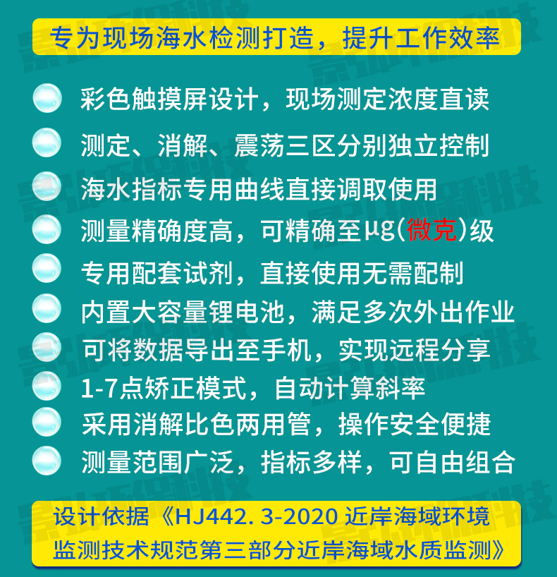 隨著科學(xué)技術(shù)的進(jìn)步,在光學(xué)、電學(xué)、機(jī)械學(xué)、材料學(xué)飛速進(jìn)步的帶動下,海洋環(huán)境監(jiān)測技術(shù)不斷更新完善,監(jiān)測儀器性能已有大幅提高,但專門用于海水水質(zhì)進(jìn)行現(xiàn)場監(jiān)測的便攜式儀器并不多見。海水的測定具有被測物含量低、干擾大、鹽度高、現(xiàn)場測定環(huán)境惡劣等特點,普通的水質(zhì)測定儀很難達(dá)到海水指標(biāo)檢測的要求,而精密的測定儀器成本高,測定程序復(fù)雜,測定周期長,很難實現(xiàn)現(xiàn)場的海水測定,針對這一情況,我司技術(shù)研發(fā)人員參照HJ442-2020《近岸海域環(huán)境監(jiān)測技術(shù)規(guī)范》、GB 17378.4-2007《海洋監(jiān)測規(guī)范 第4部分:海水分析》、以及GB3097-1997《海水水質(zhì)標(biāo)準(zhǔn)》等標(biāo)準(zhǔn)中的相關(guān)要求和檢測方法,深入研究,推出可用于實驗室、戶外、監(jiān)測船上的JH-HS800型海水環(huán)境現(xiàn)場監(jiān)測儀,解決了上述測定難點。該儀器測定方法嚴(yán)格依據(jù)技術(shù)規(guī)范,將測定設(shè)計的盡量方便、快速、準(zhǔn)確,大部分指標(biāo)可達(dá)到微克*含量的測定,幾十種指標(biāo)的測定只需要一臺儀器就能實現(xiàn),解決了海水現(xiàn)場檢測的難題。