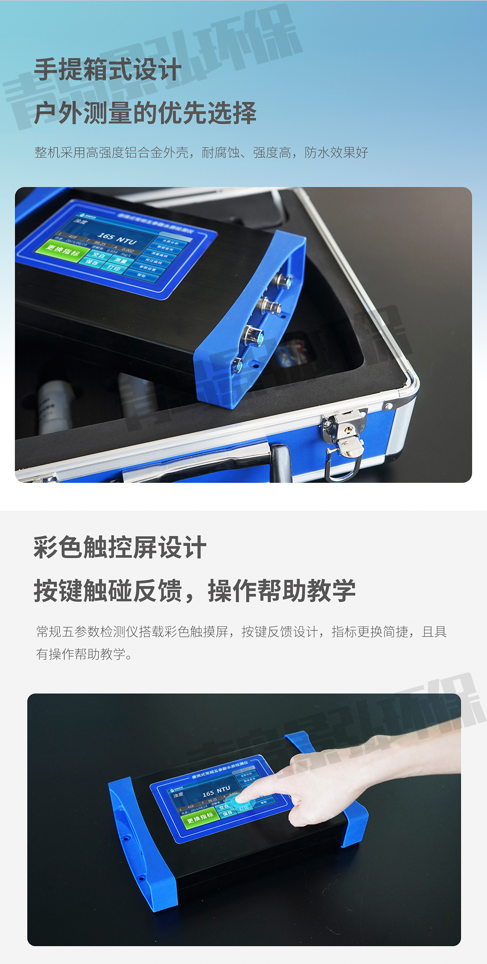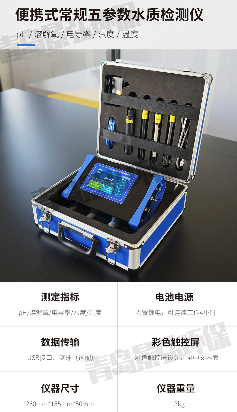 2、 儀器設(shè)計(jì)小巧輕便,內(nèi)置大容量鋰電池,方便野外水質(zhì)測(cè)定操作;